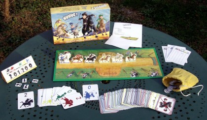 Il faut parfois se méfier des apparences. Huuue ! ressemble à un jeu de paris sur les courses de chevaux comme Jockey, et pourtant ses mécanismes sont tout à fait innovants. D'abord, il n'y a pas deux courses identiques, puisqu'un tirage, en début de partie, détermine le nombre de favoris et de tocards. Ensuite, les valeurs des cartes en main sont relatives à la situation de la course. Une carte « 2 », par exemple, doit s'apprécier en fonction du rythme de la course, à l'instant « t », ainsi que de la place du cheval concerné. Le rythme de la course peut varier de 0 à 2. Une carte permet de gagner ou de perdre N places dans la course, N étant la différence entre le rythme et la carte jouée. Ainsi, si le rythme est à 2, l'effet d'une carte 2 est de ne pas affecter le cheval joué. Si le rythme avait été à 1, cette même carte permettrait de gagner une place dans la course.