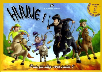 De la même façon, jouer une carte 0 sur un cheval dernier de la course, alors que le rythme est à 2, revient à ne pas le reculer, puisqu'il est déjà dernier. Il s'agit donc de parier subtilement, après avoir reçu ses cartes pour la course. Très intéressant à 2 ou 3, le jeu devient un peu chaotique à 4 ou à 5, mais il reste cependant très amusant à jouer. Variante sur les parisUn joueur qui a parié sur le bon cheval marque d'autant plus de points que celui-ci n'est pas favori. Il arrive malheureusement que personne ne gagne à la fin d'une course ou, au contraire, que trop de joueurs gagnent s'ils avaient fait le même pari. Je vous propose donc la variante suivante, valable de 3 à 5 joueurs. En début de course, chacun peut parier sur 2 chevaux, et gagnera si l'un des deux chevaux arrive en tête de la course. Toutefois, son gain sera doublé s'il est le seul parieur à toucher. On peut également décider qu'avant le dernier tour de cartes, chacun soit contraint de rayer l'un de ses deux paris… 2008 : Huuue ! sur les étalsIl n'aura pas fallu trop de temps pour que les charmants canassons de Huuue ! arrivent enfin chez nos vendeurs-conseils préférés, avec une règle très légèrement remaniée, et surtout un système de détermination de la course beaucoup plus simple.
