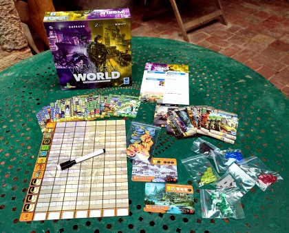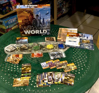Tout est pour le mieux dans le meilleur des mondes. La terre est maintenant constituée de cinq empires continentaux. Chaque joueur représente l'un de ces empires et tous vont rivaliser pour créer la civilisation la plus prospère. Pour cela, vous allez choisir des cartes, selon le principe du draft, que vous allez ensuite construire pour qu'elles vous rapportent soit des ressources soit des points de victoire. Là où le jeu innove, c'est dans la mise en œuvre des ressources. Il existe cinq types de production qui vont être évalués à tour de rôle. Tout l'art — pas du tout évident à maîtriser — consiste à être capable, lors d'une même manche, de produire de nouvelles cartes qui procureront immédiatement de nouvelles ressources. Rentabiliser ses cartes, parfois en renonçant à d'autres cartes pourtant bien attirantes, est la clé du succès. Même si le jeu est facile à comprendre dès les premières parties, il faudra en jouer quelques-unes pour progresser. Heureusement, un mode solo est proposé qui vous permettra de vous aguerrir avant d'affronter vos partenaires de jeu lors de la prochaine soirée ludique. Il faut bien que le propriétaire de la boîte de jeu ait un petit avantage, non ? It’s a Wonderful World porte bien son nom : le jeu est une petite merveille, tant par ses mécanismes que par son matériel, qui mérite amplement les ♥♥♥ de l'Escale à jeux. On attend les extensions qui ne manqueront pas de suivre.