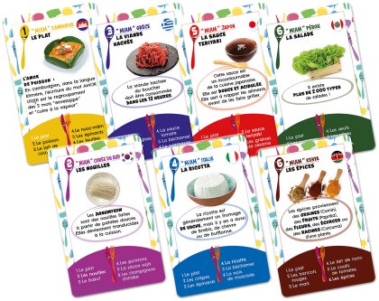 À la base, le Jeu des 7 Miam autour du Monde est un jeu de 7 Familles. L'originalité n'est pas à chercher de ce côté. Ce qui donne tout son intérêt au jeu, c'est que les familles à regrouper sont en fait des spécialité culinaires de 7 pays, et les ingrédients nécessaires à leur élaboration. Pour parfaire le tout, le jeu est accompagné d'un livret explicatif avec les recettes.