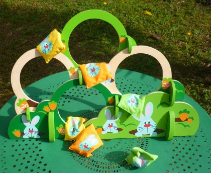 Un classique Jeu de cibles, très agréablement présenté chez Éveil et jeux - Oxybul. La cible est en bois épais et solide, tandis que les projectiles sont des pochettes délicatement lestées et sans danger. Il faudra trouver un autre moyen de se débarrasser du vase offert par la tante Josèphe… |