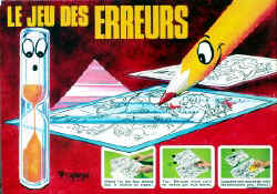 Vingt images représentent une machine, dix-huit une rue de ville moderne, quatorze un village, et douze une scène de Far West. Chaque image est la copie d'une image originale avec entre une et trois erreurs, ce qui fait qu'entre deux images de la même scène, le nombre d'erreurs s'obtient en additionnant les deux chiffres visibles, soit de deux à six erreurs à trouver. Les cartes sont distribuées au hasard, en veillant à ce que chacun en reçoive deux représentant la même scène, puis il faut trouver le plus d'erreurs possible pendant le temps d'un sablier. Une adaptation du classique jeu qu'on trouve dans les journaux et magazines, à réserver aux collectionneurs de jeux Capiépa ! |