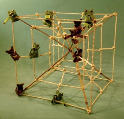 La plupart des grands classiques ont connu des versions en trois dimensions. Le Jeu du moulin ne pouvait pas échapper à cette mode. On trouve ainsi cette variante, que j'ai appelée Jeu du moulin 3D, qui répond aux mêmes règles que l'original. L'intérêt est cependant très limité. Cette version est au Jeu du moulin ce que le Sogo est au Puissance 4. Sur chaque tige, il n'est possible de jouer au niveau supérieur que si le niveau inférieur est déjà occupé. Il existe une autre déclinaison tridimensionnelle, plus proche de l'esprit de Qubic, où les joueurs placent leurs pions sur n'importe quelle intersection. J'ai possédé, il y a très longtemps, une version très encombrante de ce jeu. Ci-dessous, une réalisation amusante, trouvée sur la toile, où des grenouilles affrontent des oursons.