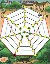 Le Jeu du renard ne doit pas être confondu avec Le Renard et les Poules, même si les thèmes sont similaires. Celui dont nous parlons ici, édité par la Manufacture Lyonnaise de Jouets probablement au début du xxe siècle, se pratique sur un tablier tout à fait original où les traits de liaison, selon leur couleur, sont autorisés à l'un et l'autre camp. Les poules, situées au début de la partie sur les cases noires, doivent atteindre la cour de la ferme en haut du plan de jeu. Pour cela, elles doivent d'abord s'approcher de la forêt où le renard se régale d'avance. Diverses adaptations sont proposées par la règle pour rendre les chances de l'un ou l'autre joueur plus importantes. Le jeu présente surtout de l'intérêt pour sa grille de jeu tout à fait originale, mais ne passera pas à la postérité. Fabriquer son jeu