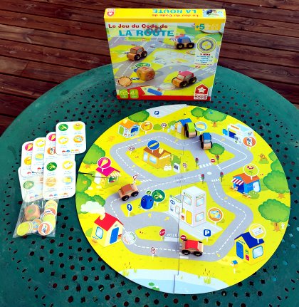 Une jolie présentation pour ce Le Jeu du code de la route qui s'adresse aux jeunes enfants en leur proposant des règles assez simples mais exigeantes : il faut bel et bien respecter le code de la route ! Le but du jeu est de remplir sa liste de course. Si le jeu sortait de nos jours, il faudrait faire ce parcours à vélo tant les distances semblent petites.
