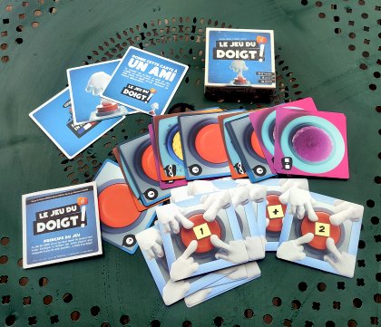 Dans la course au minimalisme, Le Jeu du doigt ! prend une sérieuse option. Le principe simple : tous les joueurs posent un index sur la carte puis le joueur actif annonce un nombre compris entre 0 et le nombre d'index présents sur la carte. Immédiatement – nous recommandons de bien vérifier préalablement que tous les joueurs savent ce que veut dire immédiatement – tous les joueurs laissent leur doigt sur la carte ou le retirent. Si le nombre annoncé est égal à celui d'index encore posés, le joueur actif gagne la carte. Quelques cartes offrent des effets supplémentaires. Note : les index ne sont pas fournis dans la boîte. Chaque joueur doit en fournir un.