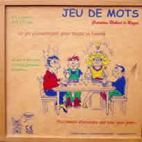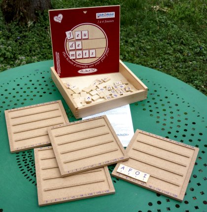 Chacun s'efforce de tirer le meilleur parti de ses lettres, en constituant des mots indépendants les uns des autres, durant un temps déterminé. Chaque lettre posée rapporte les points de la lettre. Lorsque les mots sont longs, ils apportent des bonus, de 1 point pour 3 lettres, à 20 points pour 8 lettres. Il faut éviter de laisser des lettres de côté, car elles déduiraient des points. Sans être très innovant, le jeu est agréable et réalisé avec soin en bois d'arbre et en médium. La première boîte que j'ai trouvée est d'un kitsch délicieux. Le seconde, visiblement offerte par le Crédit Mutuel, est plus sobre.