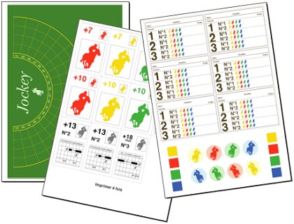 Heureusement, Jockey a été réédité en 2001 chez Berliner Spielkarten, permettant à beaucoup de jeunes de découvrir un titre qui supporte la comparaison avec beaucoup de jeux bien plus récents. Fabriquer son exemplaireMême la réédition est devenue impossible à trouver. Heureusement, ce n'est plus un problème, puisque notre ami Paul a mis en ligne tout ce qu'il fallait pour cela. Il ne fournit toutefois pas l'imprimante, le papier, etc. Le lien vers le fichier est plus haut.