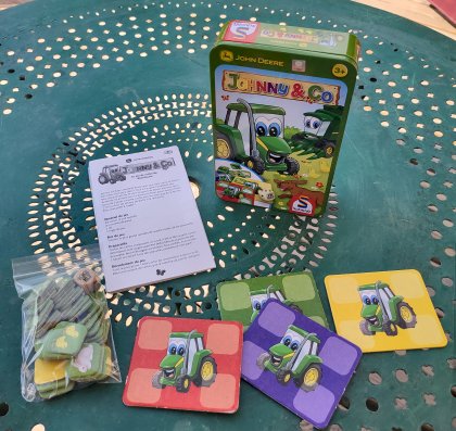Johnny & Co est un petit jeu de mémoire assez classique où vous devez réunir quatre cartes identiques. La seule originalité est que lorsqu'un joueur retourne une carte tracteur, chacun passe son jeu au joueur suivant et si vous aviez déjà réuni trois canards, il est possible que ce soit votre voisin qui termine la famille !