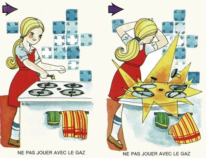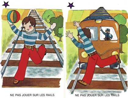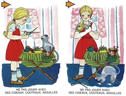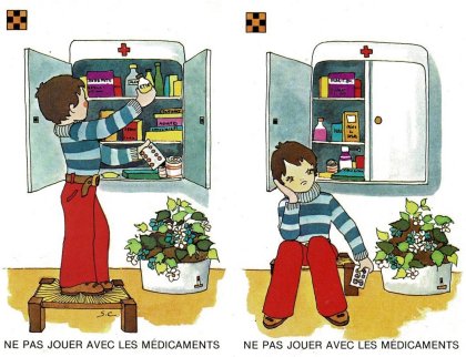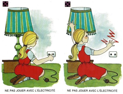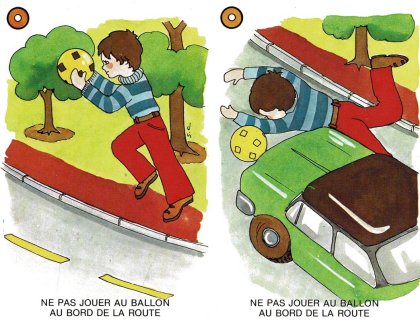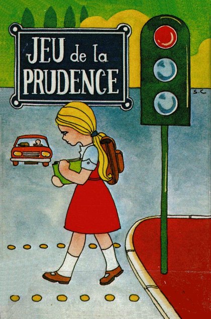 Jeu de la prudence est un jeu « éducatif » sur la sécurité. 40 cartes formant 20 paires nous enseigne tout ce qu'"il ne faut pas faire. Les règles proposées sont celles du jeu de mariage (ou memory) et du Snap. Les paires sont classées par couleur de symbole, violet étant extrêmement dangereux, rouge très dangereux et orange simplement dangereux. Curieusement, jouer avec les médicaments n'est guère plus dangereux que jouer avec les robinets. L'éditeur devait manquer de feutres violets ! Je ne résiste pas à vous partager les huit paires intitulées « IL NE FAUT PAS JOUER … ». Dangereux