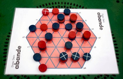 Abande fait certes penser aux jeux de Kris Burm, mais ce dernier n'en est pas l'auteur. Ce qui n'empêche pas de tester Abande avec le tablier et les pièces de Gipf ! La première version d'Abande se joue en effet sur un tablier de même taille de celui de Gipf. Plus exactement, puisqu'on y joue sur les sommets des triangles, le tablier est un réseau de trente-sept hexagones : chacune des intersections est en liaison avec six autres intersections, sauf sur les bords. La règle (en lien plus haut) est constituée de quelques contraintes simples qui génèrent un jeu inattendu et surprenant. Au départ, le tablier est vide. À tour de rôle, les joueurs introduisent une pièce ou déplacent une pièce, ou une pile, sur une pile ou une pièce voisine. Les piles ne peuvent excéder une hauteur de trois pions. À tout moment, l'ensemble des pions et piles doit rester connecté, ce qui interdit certaines poses ou certains déplacements. On peut également passer. Si les deux joueurs passent à la suite, la partie est terminée. On va alors éliminer les pions et piles asociaux : ceux qui ne sont voisins d'aucun adversaire. Cette phase essentielle doit rester à l'esprit pendant toute la partie : capturer trop de pions adverses risque de faire perdre de précieux points. Les pions restants sont comptabilisés pour chaque joueur et rapportent, selon leur hauteur, de un à trois points.
