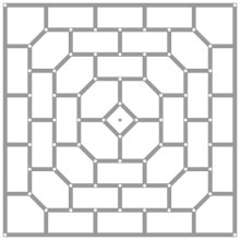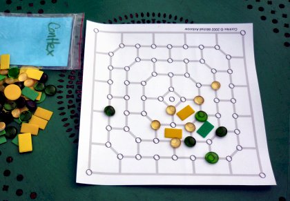 Le pavage très particulier présente l'intérêt remarquable qu'en le coloriant en deux couleurs, il se formera toujours soit un chemin nord-sud de la première couleur, soit un chemin est-ouest de l'autre couleur. C'est également le cas avec, par exemple, le tablier de Hex, mais pas avec un simple damier. L'autre originalité de ConHex tient à la façon de conquérir les cases. La case centrale est contrôlée par cinq points. Toutes les cases extérieures sont contrôlées par trois points. Les autres cases sont contrôlées par six points. Les joueurs jouent à tour de rôle, non pas sur les cases mais sur les points. Dès qu'un joueur possède la majorité des points de contrôle d'une case, il en prend possession en y plaçant un jeton de sa couleur. Le but est de former un chemin : nord-sud pour l'un, est-ouest pour l'autre. Si ConHex est difficile à trouver, on peut facilement s'en fabriquer une copie personnelle. Vous trouverez plus haut un lien vers la règle et le tablier à imprimer aux formats A4 et A3. Quelques petits pions et quelques jetons de Nain jaune feront l'affaire pour les pièces du jeu. Le tablier par Hervé BarriquandPrévu pour du papier photo A3. Vous le trouverez à la suite des règles du jeu.