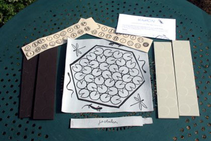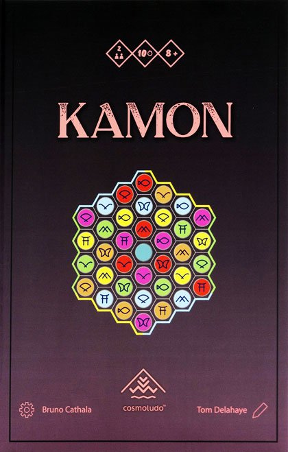 2007 : première édition chez JactaleaKamon est un jeu de connexion dont chaque partie est différente, puisque la situation de départ varie à chaque fois. La difficulté sera de bien analyser le jeu pour tirer la substantifique moelle de la situation en début de jeu, déterminée par le gisement des divers symboles. Le but est de relier deux bords opposés avec vos pièces, en les posant sur une case dont vous retirez la pastille. Mais vous ne pouvez retirer une pastille que si elle est de même rang ou de même symbole que la dernière pastille retirée. La profondeur de jeu est importante, et les premières parties sembleront chaotiques, puisque les joueurs retireront les pièces un peu au hasard. Mais il ne faut pas perdre de vue que le joueur capable de raisonner le plus profondément aura un avantage certain sur son adversaire, même si c'est parfois pour voir avant lui qu'il a probablement perdu. Du fait de la complexité d'analyse, le jeu ne présente pas le caractère intuitif qui me plaît tant dans des jeux comme le Hex ou TwixT. Ici, pas de secret : pour gagner, il faut anticiper, et pour anticiper il faut connecter ses neurones. Je l'avoue, ce jeu d'apparence guillerette est trop casse-tête pour ma vieille tête. 2020 : nouvelle édition chez