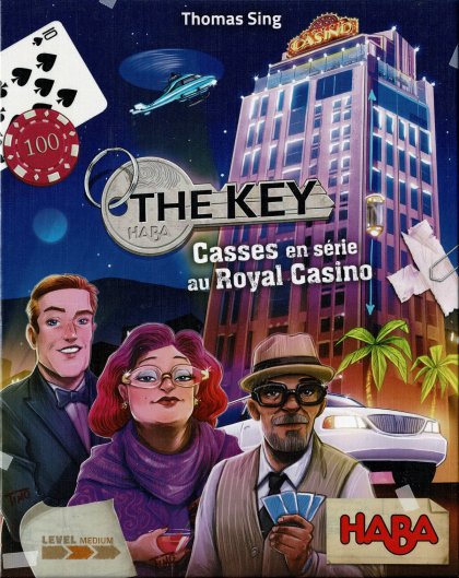 Les jeux de la série The Key, créés par Thomas Sing, sont de très habiles jeux de déduction jouables de un à quatre, qui raviront les amateurs du genre. Chaque boîte contient neuf énigmes qui utilisent un matériel commun avec plus de cent cartes d'indices comportant au dos plusieurs couleurs. Mais seules les cartes de la couleur choisie en début de partie sont valides pour l'enquête en cours. Plus les indices sont précis, plus ils vous coûtent de points. Tous les détectives qui auront finalement résolu l'affaire seront déclarés gagnants. Mais celui qui aura utilisé le moins de points d'indices sera proclamé détective de l'année ! « Une série de casses ébranle le Royal Casino. Comment les trois malfaiteurs ont-ils pu mettre la main sur le butin des coffres ? Les joueurs mènent l’enquête et combinent tous les indices sur les numéros de coffre, les malfaiteurs, les heures des casses et les codes saisis. Seule la bonne combinaison de chiffres permettra de mettre les coupables derrière les barreaux. » Par chance pour les enquêteurs, les malfaiteurs laissent beaucoup d'indices derrière eux, empreintes digitales, caches de combinaison de coffre… Il est même possible de connaître leurs allées et venues en ascenseur. The Key - Casses en série au Royal Casino est de niveau « moyen », ce qui veut dire déjà assez difficile. Il faudra analyser finement le plan des salles de jeux pour retracer les diverses rencontres qui ont eu lieu. Les cartes ascenseur ne livrent pas facilement leurs renseignements, mais avec l'expérience, on en vient à bout. Les indices les plus amusants sont ceux imaginés par l'auteur à base de polyminos. Et ça tombe bien, parce qu'à l'Escale à jeux, on aime beaucoup les polyminos ! Le plus Escale à jeuxÀ la suite des règles proposées en téléchargement, vous trouverez une grille de résolution de type intégramme