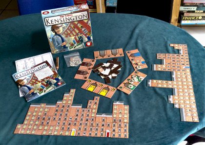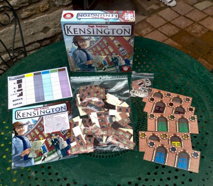 Kensington est un jeu créé par « Cielo d'Oro », un collectif d'auteurs italiens. Le jeu réunit de deux à cinq joueurs qui rivalisent pour créer le plus beau bâtiment. Pour marquer des points, il faut construire un maximum de fenêtres sans oublier de les recouvrir d'un toit. Si des chats apparaissent aux fenêtres, ils constituent un petit bonus appréciable. Mais il ne faut jamais perdre de vue la condition de fin de partie : dès que le septième toit abritant un oiseau apparaît, cela déclenche la fin de la partie. Si vous avez négligé de construire des toits, tout affairé que vous étiez à rajouter encore et encore des fenêtres, vous risquez de voir tout ce beau travail de construction ne rapporter aucun point. Les auteurs ont conçu des contraintes amusantes et habiles. Les fenêtres éclairées ou éteintes ne peuvent toucher que des fenêtres de même type, ou alors une porte, un mur borgne ou un toit. Même si l'on connaît le type de pièce recherchée, on n'est jamais sûr que celle piochée conviendra car vous devez prendre une pièce parmi celles entassées face cachée sans avoir le droit de déplacer des pièces pour voir si la forme choisie vous conviendra. Pour poser un toit, une nouvelle porte ou un mur borgne — conditions nécessaires pour démarrer de nouvelles séries de fenêtres — il faut gagner le droit de les piocher en installant d'abord des pièces difficiles. En fin de partie, deux bonus importants peuvent tout changer. Plus vous aurez de niveaux de toits différents, plus le bonus de toits sera élevé. Par exemple, cinq niveaux rapporteront 1+2+3+4+5 = 15 points ! Par ailleurs, si vous parvenez à couvrir tous vos bâtiments de toits, vous marquerez un point par colonne, ce qui peut renverser complètement le score. Le jeu est facilement abordable et ravira les amateurs de polyminos. Laissez-vous tenter, vous ne le regretterez pas.