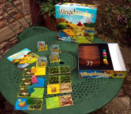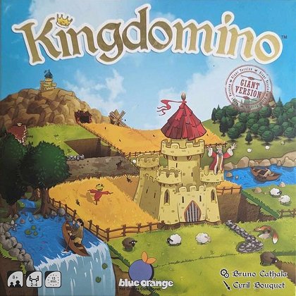 Blue Orange a proposé une version géante dès 2017. Disons-le clairement : vous ne pouvez pas jouer à cette version sur la table verte ! C'est même tout juste pour simplement y présenter le jeu. Kingdomino - Version géante est la version idéale pour jouer à deux, en version 7×7, sur votre plus grande table (idéalement 2m × 1m). À quatre, prévoir une table de ping-pong. À noter que l'extension « La Cour », proposée en téléchargement pendant le confinement, a été adaptée aux versions géantes.