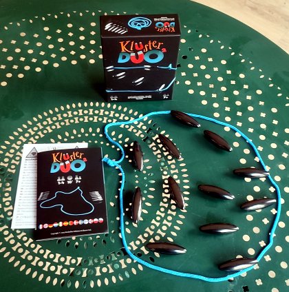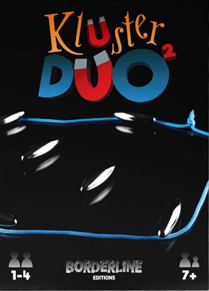 Kluster Duo est la suite du jeu Kluster – que nous n'avons pas mais que vous pouvez nous offrir – avec un titre illusoire : alors qu'on pourrait croire que le jeu ne peut être pratiqué qu'à deux joueurs, il est tout à fait possible d'y jouer à plus. Les règles ne sont pas trop fatigantes à lire et à comprendre. En gros, chacun son tour pose un aimant et si cela provoque la jonction de deux aimants ou, plus rarement, l'expulsion d'un aimant, on récupère les aimants ou on est éliminé selon la variante choisie. L'astuce, c'est qu'il est possible de déplacer la ficelle qui délimite le jeu. Mais ce faisant, on peut aussi déplacer des aimants qui rêvent de venir se coller à un de leurs congénères. Le jeu est amusant mais ne doit pas être laissé à la portée des enfants qui pourraient avaler une pièce.