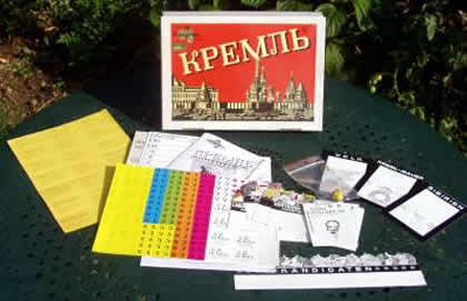 Tous les coups sont autorisés pour parvenir à vos fins : alliances, purges, dénonciations. Toutes ces activités fatiguent tant vos politiciens qu'ils vieillissent souvent très vite, et se révèlent incapables de se maintenir au pouvoir une fois qu'ils y sont parvenus. La simulation est très réussie et pleine d'humour. Le jeu a cependant un peu vieilli. La durée est longue, les règles complexes et les conditions de victoire un peu bâclées. Kremlin reste quand même un grand moment de bonheur à partager de temps à autre. Novembre 2004 : les cartes en V.F.Merci à Philippe Guillaume qui a traduit les cartes du jeu en français pour la communauté ludique. Voir lien en haut de page. |