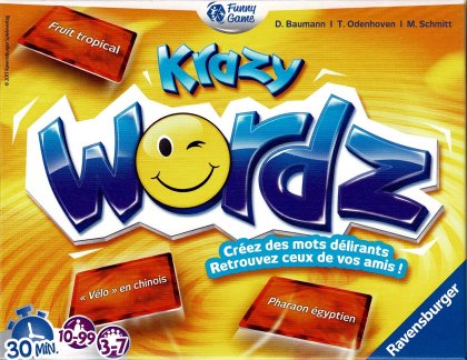 Krazy Wordz démontre qu'il est encore possible d'innover en matière de jeu d'esprit et de jeu de lettres. L'idée : tous les joueurs reçoivent un thème ou une définition (un dessert, une ville chinoise, le nom d'un bonbon, etc.), puis ils doivent créer un mot à partir de neuf lettres tirées au hasard, en espérant que les autres joueurs rapprocheront ensuite leur mot avec leur thème ou définition. Lors de la phase de vote, tous les thèmes et tous les mots sont exposés. À vous de trouver le plus de bonnes paires en espérant que les autres joueurs feront la liaison entre votre carte et le mot que vous avez créé. Il est possible de jouer entre amis ou en famille, y compris avec des enfants assez jeunes. Les moins de 10 ans seront peut-être gênés quand ils ne comprendront pas la carte qu'ils ont tirée, mais ils pourront en changer. Indispensable !