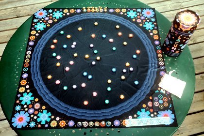 Chaque partie de Lacuna est différente puisqu'elles commencent toutes par la répartition aléatoire des 49 fleurs sur le grand tapis en tissu qui fait office de plateau de jeu. Ces 49 fleurs sont de 7 couleurs différentes, chaque couleur étant donc présente en 7 exemplaires. Il va s'agir pour les deux joueurs (malheureusement on ne peut jouer que à deux sauf à disposer de plusieurs boîtes) de devenir majoritaire dans 4 au moins des 7 couleurs présentes dans le jeu.