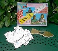 Pour cela, on tire à son tour une carte qu'on place sur le lance-mots, après l'avoir amorcé. On déclenche alors le dispositif, et la carte virevolte et retombe. Si elle tombe à l'endroit, on la prend et on rejoue, sinon, c'est au joueur suivant. Le lance-mots est un carton épais avec, au centre, une pression comme on en trouve dans les classeurs de bureau. On appuie sur un côté pour l'enfoncer et quand on appuie de l'autre côté, la pression se relâche soudainement, faisant s'envoler la lettre. Il paraîtrait, d'après des sources bien informées, qu'un modèle géant serait en construction dans un désert du Moyen-Orient. D'une longueur de 950 mètres, il serait capable de propulser un missile à plus de 150 kilomètres ! Un jour, je ferai un musée avec les jeux les plus bizarres de ma collection. Lance mots y aura une place de choix, à côté du 421 corse. |