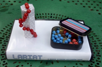 Avec Lariat, Mark Steere nous entraîne dans l'univers des tabliers volumiques. Celui-ci est un cylindre à la base creuse avec une case centrale au sommet. Le but est relier une case du bas avec le sommet ou un anneau encerclant le sommet. Attention aux pièges : un simple cercle de douze pions à la base est, par exemple, une configuration gagnante. Le modèle présenté ici, assez fragile, est en carton et punaises. Pour une utilisation plus intensive, on pourra envisager un cylindre en bois proprement percé de trous avec des chevilles colorées. Bon courage pour la fabrication ! |