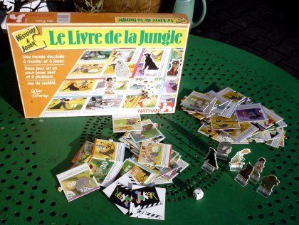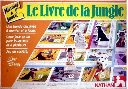 Le Livre de la jungle - Histoire à jouer n'est rien d'autre qu'un Jeu de l’oie, dont il respecte même le nombre de cases. L'intérêt réside dans l'histoire racontée au fil des cases. La partie commence par la mise en place du parcours, composé de cases qui s'accrochent comme des pièces de puzzle. Pour le créer, les joueurs jettent le dé à tour de rôle, et placent autant de cases qu'indiqué par le nombre obtenu. La règle est fort curieuse car elle ne signale ni but du jeu ni vainqueur pour cette première phase ; j'en conclus donc que le joueur qui obtient les plus grands nombres gagne la satisfaction de placer le plus de pièces.