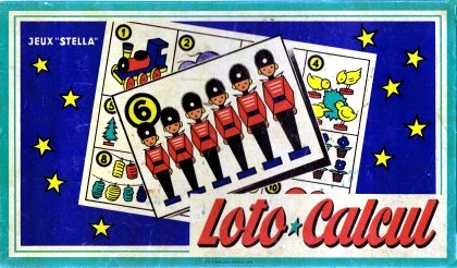 J'entends au loin le lecteur étonné qui se dit « Tiens, un Loto ! Et pourquoi celui-ci a-t-il droit à une présentation pour lui tout seul, alors que ses confrères sont tous regroupés sur une seule fiche, en dépit de leur multitude et de leur variété ? » La raison en est que la règle est légèrement différente. L'animateur de la partie de Loto Calcul tire une carte et annonce le motif représenté sans la quantité. Par exemple « Soldats » ou « Cochons ». Le joueur doit alors, pour prétendre gagner la carte, annoncer la valeur de celle-ci. On n'est donc plus tout à fait dans le jeu de hasard pur, même si on n'en est pas très éloigné. Une autre raison de la présence de Loto Calcul dans ma collection est que je le trouvais trop mignon…