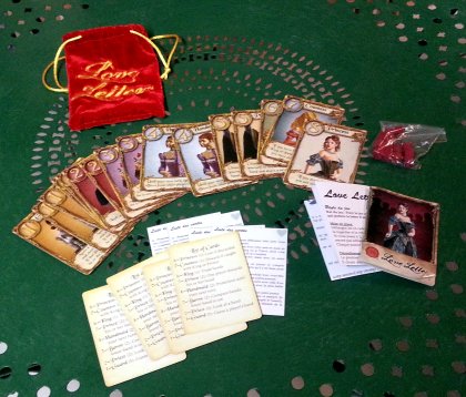 Love Letter est l'un des meilleurs jeux du genre. Les seize cartes, les treize pions et la règle sont emballés dans un élégant sachet en velours brodé (probablement par des ouvriers suisses syndiqués) afin de justifier un prix de vente minimum. Chaque joueur reçoit une carte. Le but est de terminer la manche avec la carte la plus élevée. Pour y parvenir, il faudra user de ruse, de bluff parfois et avoir un peu de chance. Le vainqueur est celui qui remporte un nombre de manches déterminé par le nombre de participants. Amusant et futé. |