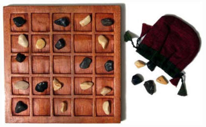 | Caractéristiques | jeu de pions, tablier carré et pions, tablier 5 x 5 cases et pions, traditionnel ou issu de… | |||