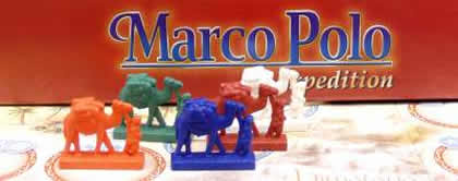 Marco Polo Expedition nous entraîne dans une course de dromadaires. Ils se doublent les uns les autres en essayant de prendre la tête de la caravane, avec tous les avantages que cela procure. Les déplacements s'effectuent en jouant des combinaisons de cartes, déterminées par la case libre devant soi. Les joueurs ont tout intérêt à rester dans la caravane, car lorsqu'ils avancent, ils sautent par-dessus tous les chameaux qui les précèdent jusqu'à atteindre la première case vide. S'ils se sont laissé distancer, ils ne pourront avancer que jusqu'à la prochaine case libre immédiatement devant eux. D'un autre côté, faire seul une échappée est difficile, car on ne bénéficie plus de l'effet du peloton… Le tour d'un joueur est très court : il peut poser une combinaison de cartes lui permettant d'avancer d'une case libre. Il doit ensuite tirer une carte parmi les cinq exposées face visible ou dans paquet face cachée. La partie est également courte, puisqu'elle excède rarement trente minutes et on n'attend pas son tour : déjà deux bons points. Mais en plus, le matériel est de toute beauté. Ravensburger a dû rappeler le Directeur de collection qui nous avait enchantés avec Le Lièvre et la Tortue, Ave César ou Caravane. Les chameaux, qui font penser aux chars d'Ave César, sont d'ailleurs ceux du jeu Caravane. Quant aux trésors, les amateurs auront reconnu ceux de Trésors au fond des mers.