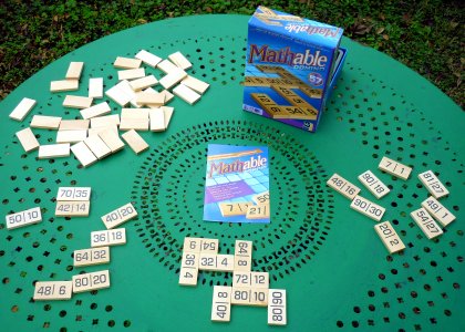 La répartition des dominos fait la part belle aux multiplications et aux grands nombres. Le domino « 80 | 90 » est une exception notable, puisque c'est la seule pièce où l'un des nombres n'est pas un multiple de l'autre. De ce fait, les nombres 0, 11, 13, 17 et 19, issus d'additions ou de soustractions, mais non de multiplications, et qu'on trouvait dans le Mathable classique, ont ici disparu. Ils me manquent un peu. Les petits nombres, de 1 à 10 sont considérablement moins nombreux : ils sont trente au lieu de soixante-dix. Les gagnants de l'opération sont les grands nombres, présents en de multiples exemplaires alors qu'ils étaient uniques dans le jeu original. Par exemple, le « 48 » est présent trois fois, associé au « 6 », au « 8 » et au « 24 », mais pas au « 2 ». Au final, Mathable Domino est bien moins séduisant que son aîné. Il présente cependant l'avantage considérable de la simplicité. Surtout, on n'est plus obligé de tenir des comptes fastidieux, puisque pour gagner, il suffit de terminer ses dominos avant les adversaires. La règle prévoit qu'un domino donnant deux résultats valables pour chacun de ses côtés permet de rejouer. Je vous propose ci-dessous deux variantes simples qui peuvent agrémenter un peu les parties. Variantes Escale à jeuxLes deux variantes ci-dessous sont indépendantes l'une de l'autre.