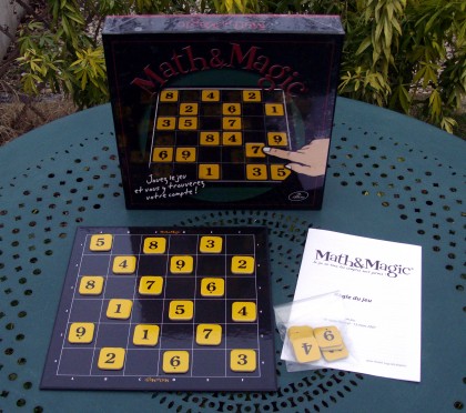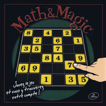 Math & Magic est auto-édité par Jacky Bonnet, un amoureux des maths et des nombres. Sur une idée assez proche de celle de Trio, mais avec seulement 18 cartes et une bien plus grande liberté dans le choix des opérations, il s'agit de composer des nombres en utilisant 3 chiffres et les opérations de son choix. Dans l'image ci-dessus, on peut par exemple trouver 50 avec (8x7)-6 ou 49 avec (5x8)+9. Lorsque ce n'est pas possible, on peut glisser l'un des pions dans sa ligne ou dans sa colonne, mais on ne marque alors que 1 point au lieu de 2. On peut bien sûr jouer en simultané, mais pas avec moi, s'il vous plaît : j'ai déjà mal à la tête.
