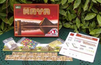 Le jeu se déroule en phases. Lors de la première phase, une vente aux enchères permet d'acquérir des pierres, en plaçant des cartes cachées devant les carrières. Sur chaque carrière est affichée le gain prévisible pour le premier, le deuxième, et parfois le troisième ou le quatrième. De plus, chaque carrière offre au meilleur enchérisseur un pouvoir spécial, qui pourra lui servir par la suite (jouer en premier ou deux fois, gagner une pierre etc.). Pendant la phase d'enchères semi-cachées (on connaît le type de carte, forte ou faible, mais pas la valeur exacte), il faut savoir s'arrêter à temps. Inutile de gagner trop de pierres, car on ne pourra en transporter que le nombre correspondant aux cartes qui restent en main. Cette première phase, qui rappelle un peu des jeux comme Corruption, ne présente pas de réel caractère innovant. Elle est toutefois bien conçue, pas trop longue, et chacun peut à peu près contrôler ce qui se passe. La deuxième phase du jeu est beaucoup plus innovante, et elle est réellement réussie. Les pierres durement gagnées vont permettre de construire les 4 édifices. Plusieurs règles régissent cette construction. Chaque niveau de pyramide comporte un nombre précis d'emplacements pour les pierres. Tous les niveaux identiques doivent être terminés avant qu'il ne soit possible de construire au niveau suivant. Un joueur ne peut construire à un niveau que si au moins une de ses pierres est au niveau inférieur. Enfin, un joueur qui parvient, en posant une pierre, à terminer un niveau où il est seul majoritaire, peut gratuitement poser une pierre de bonus au niveau supérieur, même si tous les autres niveaux identiques ne sont pas terminés. À la fin de la pose des pierres, on attribue des primes aux premiers et aux seconds de chaque niveau, qu'ils soient complets ou non. Puis chaque joueur qui a touché une prime sur un niveau perd une des pierres qui lui a permis de gagner cette prime. La perte de la dernière pierre d'un niveau peut entraîner, pour respecter la règle d'héritage, un effet Alles im Eimer sur les pierres des niveaux supérieurs, qui sont alors toutes retirées. Au bout de trois manches, la partie est terminée. On a alors le sentiment d'avoir joué à un grand jeu, qui a d'ailleurs été récompensé au fameux concours d'auteurs de jeux Hippodice en 2002. Dernière chose, très importante à mes yeux : Maya, comme la plupart des jeux Abacusspiele, est vendu avec une règle entièrement illustrée en trois langues, dont le français. Ceci permet à tout le monde de jouer au même jeu, ce qui n'est pas toujours le cas lorsque plusieurs traductions différentes circulent dans la nature. |