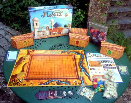 Quand on voit la simplicité de Medina, on se demande pourquoi personne n'y a pensé avant. Medina est un jeu de placement aux règles extrêmement simples, mais d'une richesse exceptionnelle. Les joueurs à tour de rôle posent des pièces, agrandissant des palais qui n'appartiennent encore à personne. À son tour, un joueur peut choisir de prendre possession d'un palais en construction. Il ne pourra alors plus être agrandi, sauf peut-être par quelques étables. La place est réduite dans la ville, et les bons emplacements très surveillés. Il faut bien peser chaque décision. Choisir, c'est renoncer ! En effet, une fois qu'un joueur aura pris possession d'un palais d'une couleur, orange par exemple, ce joueur ne pourra plus prendre possession d'un autre palais orange. Mais le pire, c'est qu'il peut se trouver contraint d'agrandir un palais orange qui appartiendra à quelqu'un d'autre. Tant qu'il peut poser des pièces, un joueur doit le faire, même si cela lui est défavorable. Ajoutez pour le plaisir quelques règles concernant des marchés, des étables et des remparts qui viennent accroître la valeur de votre palais, et vous aurez touché un grand jeu.