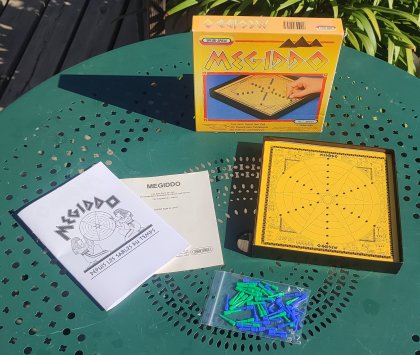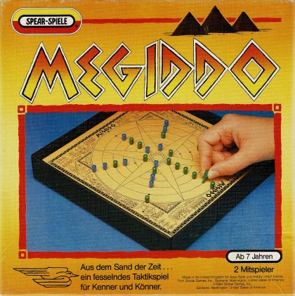 Initialement publié par un petit éditeur étatsunien en 1985, Megiddo a ensuite connu de nombreuses éditions dans divers pays; la version qui est arrivée à l'Escale à jeux est une version proposée par la branche allemande de Spear. Le titre du jeu fait référence au site de Megiddo La bataille qui se livre sur le tablier est beaucoup plus paisible. Certains y ont vu une réimplantation de Pente sur un tablier cylindrique (en fait, torique si on joue selon la variante Grand Master). La comparaison est justifiée : on gagne dans les deux jeux en réalisant un arrangement ou en capturant un certain nombre de pierres adverses. Mais Megiddo descend aussi un peu d'Othello puisque les pierres entourées ne sont pas retirées du tablier mais transformées en pierres de sa propre couleur. Une capture ordinaire peut même engendrer d'autres captures en chaîne, parfois jusqu'à la victoire. Chaque victoire est quantifiée et le premier joueur qui atteint 36 points remporte le match. Comme tous les jeux combinatoires, Megiddo gagne à se jouer à deux ou à deux équipes. Le jeu est facile à réaliser avec une règle, un feutre et quelques billes chinoises.