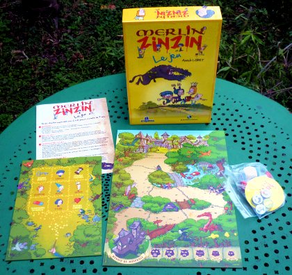 L'idée est de sauver les héros poursuivis par un monstre, en faisant avancer les pions sans en laisser en arrière. Le jeu est coopératif. Chaque joueur à son tour lance le dé qui détermine comment il doit agir : en propulsant un jeton, en soufflant dessus, etc. Le tout se passe sous les encouragements et les cris des partenaires, car le temps est compté : le pion du monstre est un sablier qui s'écoule, et avance à chaque fois qu'il se termine. On joue donc contre la montre et c'est souvent épuisant, d'autant plus que des cartes Chance font perdre un peu de temps, mais toujours avec humour. L'esprit du jeu, comme les illustrations, participent à la réussite de Merlin Zinzin. Il a d'ailleurs été récompensé par plusieurs prix, ce qui est amplement justifié. |