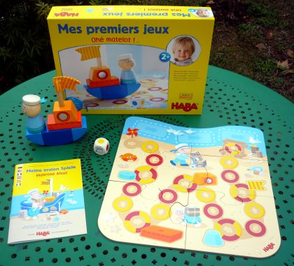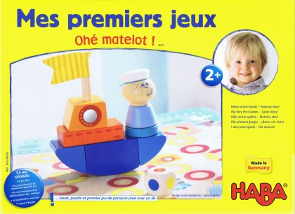 La gamme « Mes premiers jeux » s'adresse aux très jeunes joueurs, à partir de deux ans. Les titres proposés sont à la frontière entre jouet et jeu, mais puisqu'ils comportent une règle, il s'agit bien de jeux. Mes premiers jeux - Ohé matelot ! est un jeu de coopération : tous les joueurs essayent d'amener Martin le matelot à l'embarcadère, avant que le bateau ne parte. En route, on assemblera petit à petit les éléments du navire. On commence par assembler le plan de jeu formé de six pièces de carton très épais. Au départ, le bateau ne comporte que ses deux mâts. Les cinq éléments qui viendront s'y fixer sont déposés sur les cases identifiées du parcours de Martin, tandis que le bateau est placé devant la piste qu'il doit parcourir jusqu'à l'embarcadère.