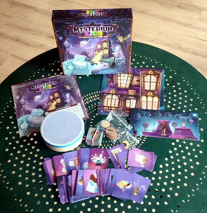 Imiter le son du tonnerre, du cheval, du bowling ou de la hache, rien de bien difficile. Imiter le son du parfum ou de la bulle de savon, c'est un peu plus difficile… Mais avec Mysterium Kids - Le Trésor du Capitaine Bouh, ça se corse ! Car ce sont des enfants à partir de 6 ans qui doivent nous faire deviner une ou deux cartes parmi les cinq affichées. De plus, comme ils incarnent un fantôme qui ne peut ni parler, ni chanter, ni siffloter, ni chuchoter, ils ne disposent que d'un instrument oublié dans le château hanté pour nous faire deviner la ou les cartes : un tambourin. Mais, avec ce tambourin, tout est autorisé : on peut utiliser la peau, le côté, le tissu et frotter, taper, frapper fort, gratter, caresser, etc. Même entre joueurs plus âgés, ce n'est pas toujours facile !