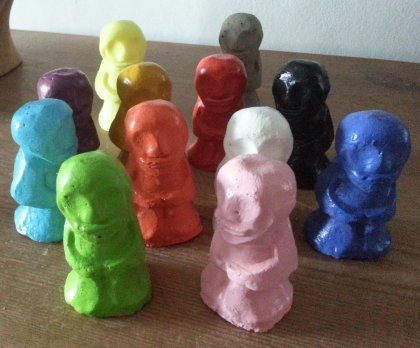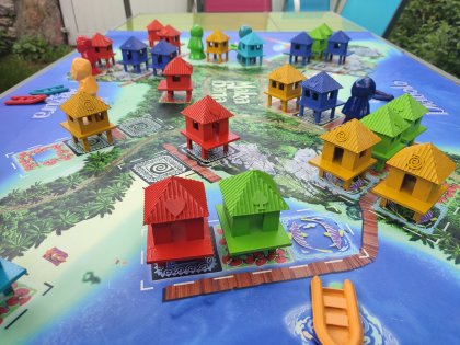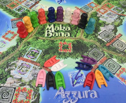 Maka Bana méritait une version surdimensionnée. Voilà qui est fait avec cette version réalisée maison : Maka Bana XXL, qui peut se pratiquer jusqu'à 10 joueurs ! Les paillotes sont en MDF, découpées au laser, assemblées et peintes. Pour les tikis, le modèle choisi est celui de la sculpture réalisée par ma chère et tendre. Le tiki original, d'une hauteur de 50 cm, a été numérisé en 3D, puis imprimé avec une hauteur de 8 cm au FabLab de Cluny. À partir de ce modèle, un moule en silicone a été réalisé qui a ensuite permis de mouler 10 tikis en béton qu'il ne restait plus qu'à peindre.