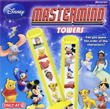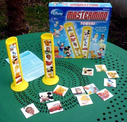Mastermind Towers est un jeu de déduction pour deux joueurs. Chacun reçoit six pièces qu'il dispose secrètement dans sa tour. Son adversaire reçoit les six mêmes pièces dans un format un peu plus grand. Le but du jeu est de reconstituer, par questions successives, l'ordre de la tour adverse. Il est possible, tant qu'on reçoit une réponse positive, de poser plusieurs questions lors de son tour de jeu, mais sans dépasser trois. La règle officielle limite le type de questions : elle doivent contenir le nom de deux pièces ainsi que le mot « au-dessus » ou « au-dessous ». Par exemple : « Winnie est-il au-dessus de Donald ? ». Nous sommes beaucoup moins exigeants en acceptant toutes les questions auxquelles il est possible de répondre par oui ou non, comme par exemple « Les deux personnages féminins sont-ils l'un à côté de l'autre ? ». À vous de choisir vos restrictions. Les plus jeunes joueurs n'utiliseront que cinq ou quatre cartes. Un bon jeu de déduction.