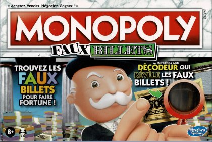 Sur une trame classique, Monopoly Faux Billets apporte une petite nouveauté amusante : certains billets et certaines cartes chance sont des faux. Heureusement, ces faux sont détectables grâce à un décodeur (un filtre à fines rayures), ce qui permet de les confisquer au fraudeur. À la fin de la partie, vrais et faux billets sont comptabilisés de la même façon !