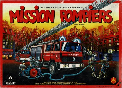 Mission pompiers a été créé par un pompier, visiblement dans un but de promotion de cette activité. On joue en mode compétitif mais les camions de pompiers appartiennent à tous. Les cartes mission sont remportées par le joueur qui aura tous les jetons demandés par cette carte même si c'est un autre joueur qui a amené le camion sur le lieu de l'intervention. L'auteur du jeu s'étonnait qu'il n'existe aucun jeu sur le thème des pompiers. Il n'était peut-être pas au courant qu'on trouve aussi des jeux ailleurs que dans les rayons des grandes surfaces à Noël !