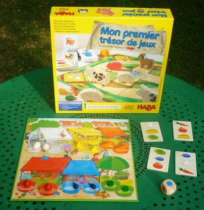 Si le matériel utilisé pour jouer à Une journée au marché est strictement identique à celui d'Allons faire les courses, la règle est cependant assez différente. Ce n'est plus un simple jeu de hasard : une petite part de tactique intervient. Il se pratique à partir de cinq ans, au lieu de trois pour son cousin. Toutes les listes de courses appartiennent à tous les joueurs. Après avoir jeté le dé, on pose l'aliment correspondant sur la liste de son choix. Au début du jeu, deux listes peuvent recevoir un aliment, puis une et enfin plus du tout. Les vrais choix sont donc à faire quand deux listes peuvent recevoir un aliment. On peut aussi corser l'affaire en autorisant à jeter à nouveau le dé après un approvisionnement réussi, ce qui ajoute un peu de prise de risque. Une journée au marché fait partie des dix titres proposés dans le coffret Mon premier trésor de jeux. |