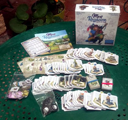 Il fut un temps où, quand on voulait distribuer des cartes à plusieurs joueurs, on se contentait de battre le paquet puis de les donner une à une, en rotation, aux participants. Pour atténuer le hasard de ce type de distribution, est venue la mode de la draft. Chacun reçoit des cartes en nombre équivalent, en conserve une puis donne le reste à son voisin, et ainsi de suite jusqu'à ce que chacun soit servi. Et maintenant, on drafte à tout va, avec, inévitablement des erreurs chez les joueurs peu aguerris qui donnent leurs cartes du mauvais côté ou oublient d'en conserver, ou… Mais comme le draft est à la mode, et bien draftons ! Je suis un peu mauvaise langue, car dans le jeu qui nous intéresse ici, où le joueur doit constituer une pyramide de 10 cartes avec des contraintes de voisinage importantes, une simple distribution aléatoire n'aurait aucun sens. Seul le fameux draft permet à chacun d'espérer récupérer les douze cartes qui lui permettront de sélectionner les dix plus intéressantes pour son objectif. Un des principaux attraits de Mon royaume pour un conte est l'apprentissage progressif de la règle. Selon le niveau du groupe de joueurs, on pourra intégrer ou non des contraintes et bonus. En famille, avec de jeunes joueurs, le niveau de base ou celui juste supérieur sera adapté. Avec des joueurs chevronnés, on jouera rapidement la règle complète. Les parties sont rapides et il n'est pas rare qu'on en enchaîne plusieurs avec plaisir.