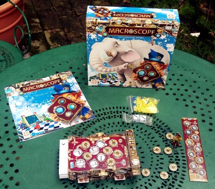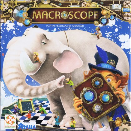 Les joueurs de Macroscope doivent deviner quelle image est cachée dans la boîte à trou, en dévoilant petit à petit des portions du dessin. L'idée n'est pas nouvelle : elle avait déjà été utilisée dans Photo mystère. Macroscope bénéficie cependant d'une règle un peu plus élaborée tout en restant très simple. À son tour, un joueur doit retirer un ou deux caches. S'il décide d'annoncer le dessin, il gagne ou perd autant de points que de caches encore en place. S'il renonce à annoncer, il gagne autant de points que de caches retirés. En cas d'annonce, Il est possible de défier un concurrent en dehors de son tour de jeu. Mais on doit alors lui payer deux points. Les dessins, au nombre de 400, permettent de nombreuses parties. Et rien ne vous empêche de créer vos propres dessins ou de découper des photos dans des magazines. Note :Une erreur a dû se glisser dans la règle française, dans l'exemple de la page 4. Les joueurs ne prennent aucun cristal avant de proposer une solution. Il convient donc d'ignorer les deux phrases « Simon prend 2 cristaux dans la réserve pour ses deux disques. Lea prend un cristal pour son disque. »
