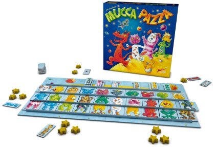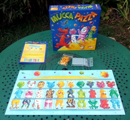 Mucca Pazza s'adresse aux jeunes joueurs. Et même aux très jeunes puisque deux règles sont proposées dont une accessible dès 4 ans. L'idée générale est de reconstituer des animaux voyageurs de l'espace coupés en morceaux, à la manière de Les Petits Drôles ou de Mix-Max. Pour rétablir les voyageurs dans leur intégrité, on procède par glissement : on prélève une tablette à droite ou à gauche puis on la pousse de l'autre côté. Le but est de reconstituer l'image en trois opérations au maximum. Les joueurs plus âgés se voient proposer une règle un peu plus sophistiquée, avec des jetons permettant de jouer une fois supplémentaire quand ils le jugent nécessaire.