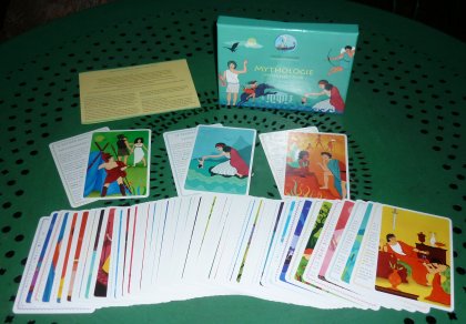 Mythologie Mytholo… jeux est composé de quatre-vingt-une grandes cartes. Quarante d'entre elles représentent des expressions et des scènes mythologiques. Elles sont associées à quarante autres expliquant l'origine de cette expression. La dernière carte représente Héra. Elle est utilisée pour Mistigri. Dix règles sont proposées, avec de nombreuses variantes :