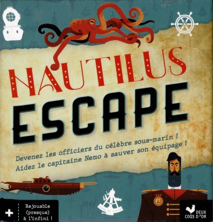 Nautilus Escape Le Nautilus est dans une fâcheuse posture. Son capitaine Nemo vous a chargés, ses fidèles officiers, de ramener le sous-marin à bon port, loin des vingt mille menaces qui pèsent sur lui ! Affrontez une pieuvre géante, remettez le Nautilus en état et éloignez-vous des dangers avant qu'il ne reste prisonnier des profondeurs. Contenu :