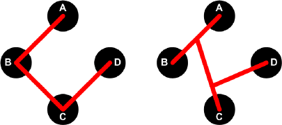 À gauche, les villes A et D, raccordées à une seule autre ville, rapportent 1 point. Les villes B et C, raccordées chacune à deux villes, rapportent 2 points. Total : 1+2+2+1=6. À droite, chacune des quatre villes est reliée aux trois autres, sans traverser une autre ville (ce qui couperait la liaison directe)